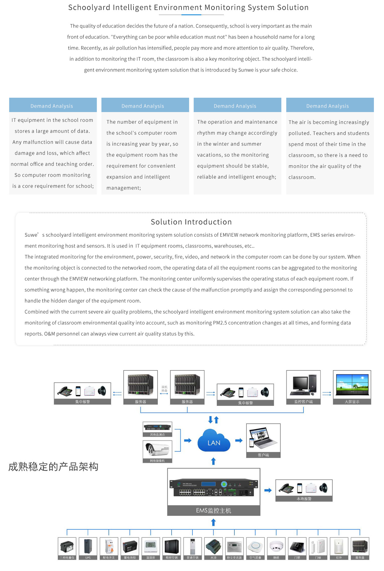 Suwe’s schoolyard intelligent environment monitoring system solution consists of EMVIEW network monitoring platform, EMS series environment monitoring host and sensors. It is used in IT equipment rooms, classrooms, warehouses, etc..