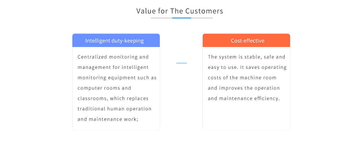 Intelligent duty-keeping:Centralized monitoring and management for intelligent monitoring equipment such as computer rooms and classrooms, which replaces traditional human operation and maintenance work;